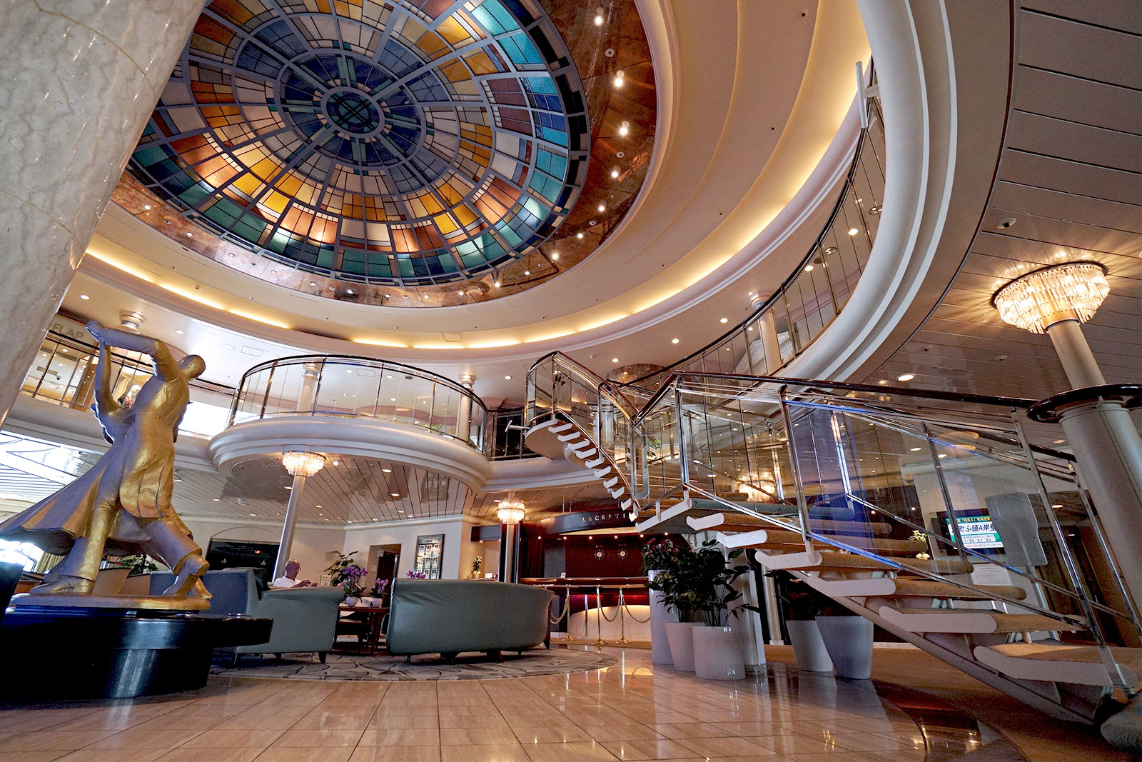 乗船後、笑顔で出迎えてくれたスタッフに従って進み、5Fに上がると「アスカプラザ」という広々とした円形のホールに出た。中央が吹き抜けになっているので、6Fの一部が見える形だ。ラウンジにはソファがあり、端にはレセプションがある。手続きは思っていたよりも簡単で、スムーズだった。最後に渡されたカード1枚で客室の解錠ができるだけでなく、船内で買い物をしたり有料サービスを受けたりすることもできるそうだ。これだけで船内を自由に歩き回れるのは便利だ。