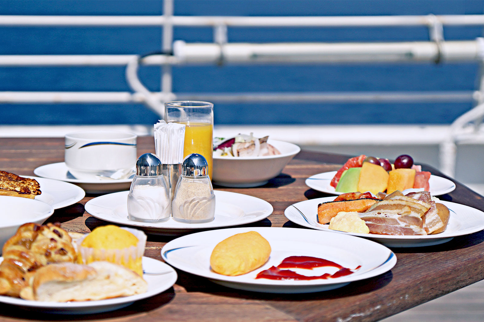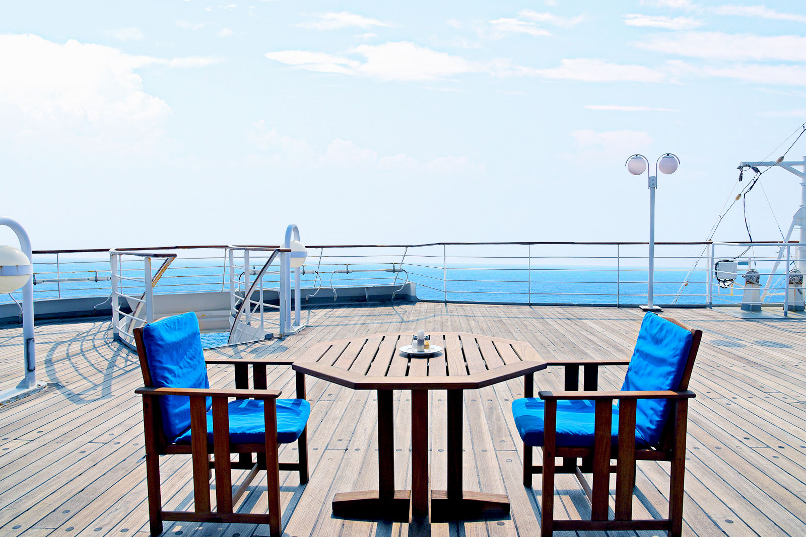 デッキには、木製のイスとテーブルが並んでいる。せっかくなので、海側に近い席を選んだ。デッキがあるのは船尾側で、海には船の航跡が白く泡立ちながら後方に向かって伸びている。海を眺めながらのビュッフェなんて、まるで映画のワンシーンのようだと思った。