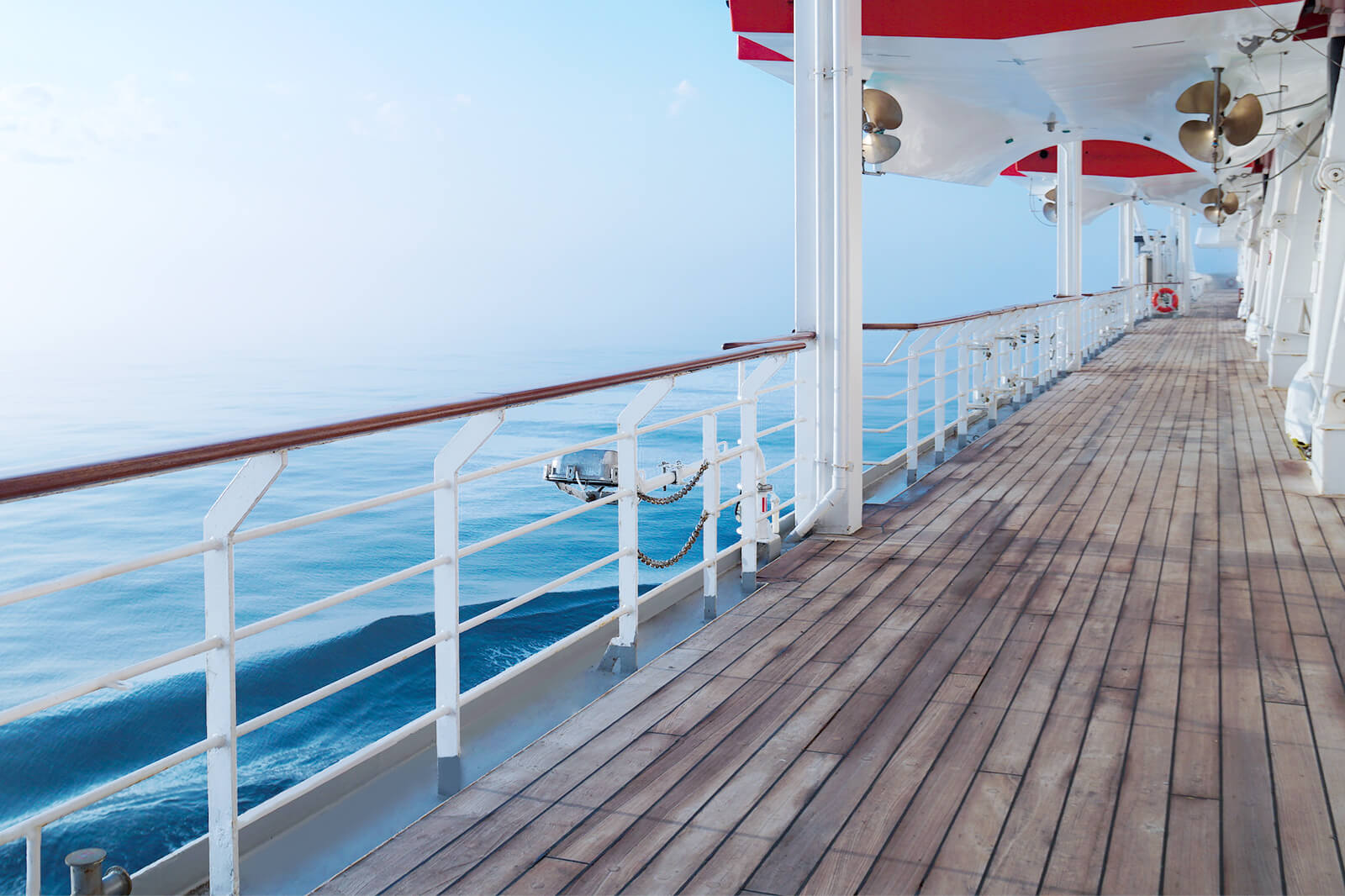 期待していた以上のビュッフェの内容に気持ちが高まり、つい食べ過ぎてしまったので少し歩くことにした。ガイドブックによると、7Fにあるプロムナードデッキがウォーキングやジョギングをするのに適しているらしい。階下に降りてデッキへ出ると、また一気に海風を浴びた。船の表示には「1周440m」とある。歩くとだいたい5分くらいだろう。矢印に従って歩いていくと、途中、ジョギングをしている人が何人か横を通り越していった。デッキにいるのは10人くらいだ。宿泊期間が長いほど、運動がしたくなるのに違いない。