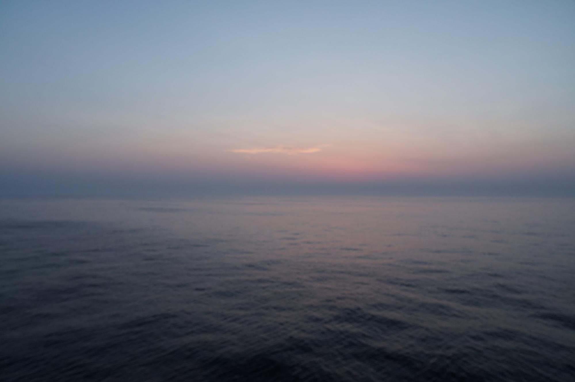 明け方4:30に目覚めて身支度を整えた後、期待を込めてカーテンを開けると、目の前には一面の海が広がっていた。バルコニーのドアを開けて外に出ると、一気に爽やかな海風が流れ込んでくる。どこまでも水平線が続いていて、もう陸は見えない。自分が今、海の真ん中にいることを実感した。太陽が水平線の向こうから徐々に昇ろうとするところで、こんな景色は今まで見たことがない。あまりにも爽やかな朝の時間をしばらく堪能した後、もう一眠りしてから朝食をとりに行くことにした。