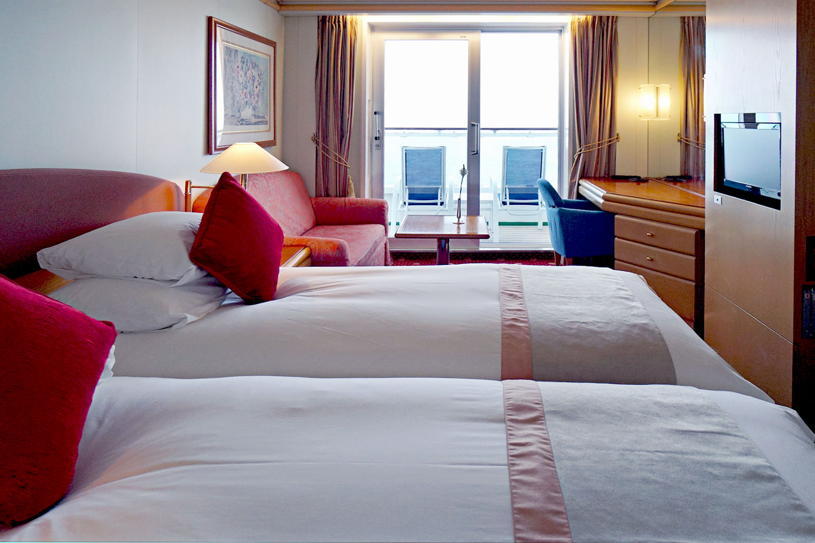 ひとまず客室へ向かおうと、船の端から端まで真っ直ぐに続く長い廊下を歩いていると、船内クルーの方々がすれ違う度にフレンドリーにあいさつをしてくれて、温かさを感じた。飛鳥IIには8タイプの部屋があり、どの部屋もツインベッドで窓から海が見えるのが特徴だ。私の部屋は、Eタイプ。入ってみると部屋は長方形で、意外と奥行きがある。何より、この部屋にはバルコニーがあるのが最大の特徴なので、外に出るのが楽しみだった。